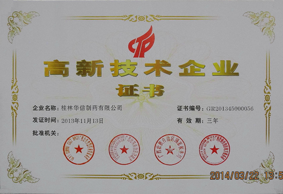 2014年3月,桂林華信制藥有限公司獲得國(guó)家級(jí)高新技術(shù)企業(yè)認(rèn)定證書和牌匾,我們是靈川縣第一家獲得高新技術(shù)企業(yè)認(rèn)定的生產(chǎn)廠家,充分說明了我公司的研發(fā)水平和管理水平又上了更高的一個(gè)臺(tái)階,為公司今后的快速發(fā)展提供了更好的平臺(tái)。