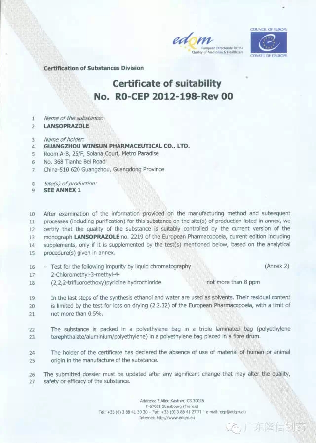 華信制藥追求卓越,務必為客戶提供高品質(zhì)產(chǎn)品。華信生產(chǎn)的蘭索拉唑原料國內(nèi)銷量第一,2014年4月更是獲得歐盟CEP證書,使華信制藥成為全國蘭索拉唑生產(chǎn)廠商中唯一取得此認證的公司。